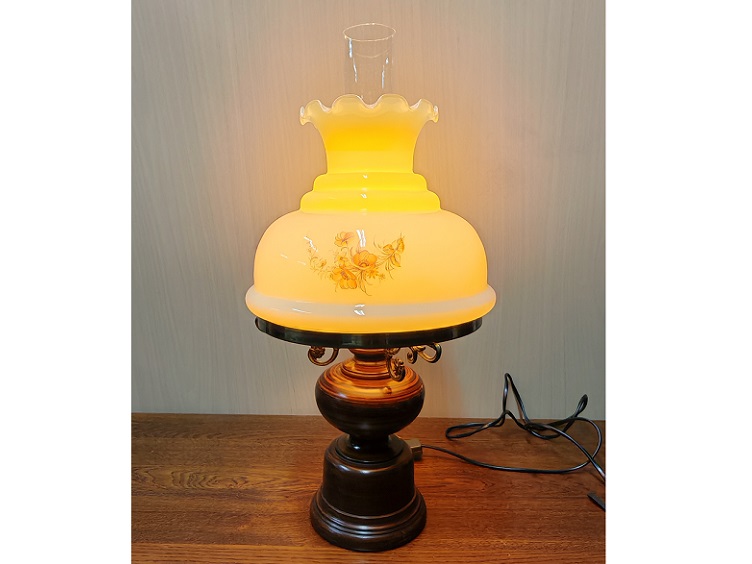 Lampa cylindrová materiál:drevo,sklo,mosadz, výška:52cm x 25cm priemer klobúka, cena:55,-Euro