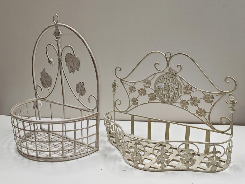 Závesné kovové košíky o rozmere:vľavo poloblúkový 31cm dĺžka x 41cm výška x 16cm hĺbka cena:25,-Euro,, vpravo zdobený o rozmere:40cm dĺžka x 30cm výška x 18cm hĺbka cena:28,-Euro
